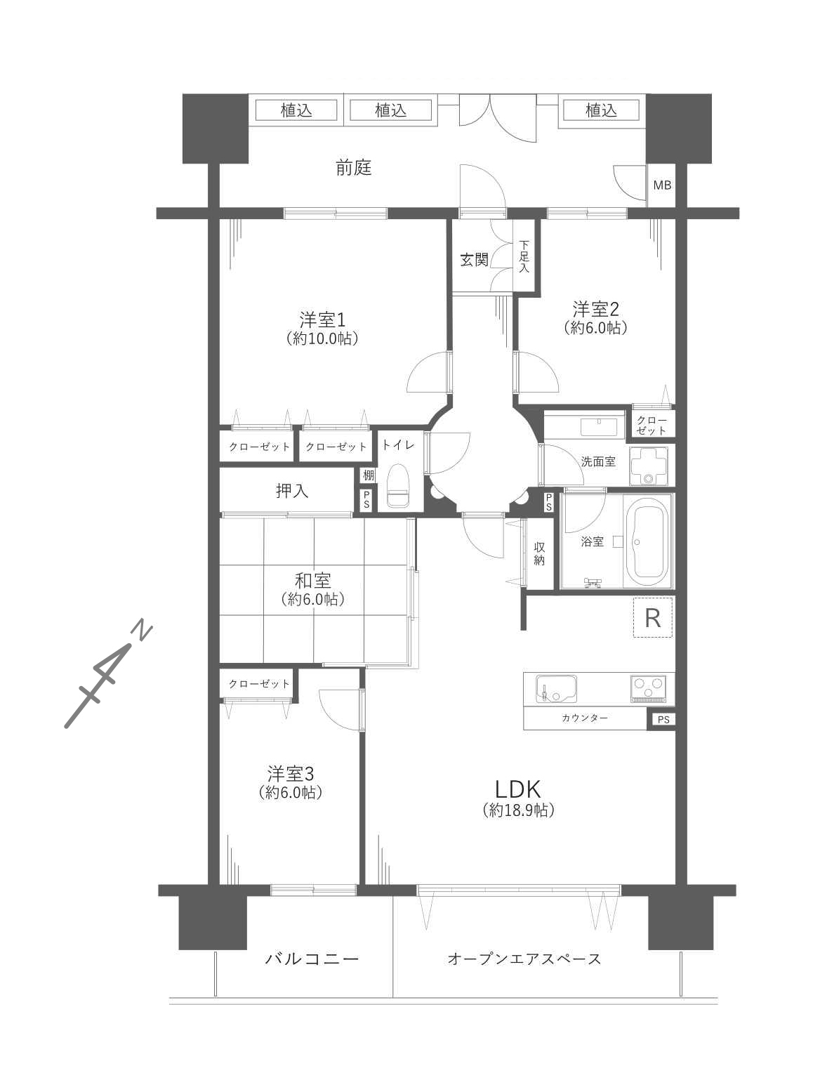 - バルコニー面積:7.60㎡、オープンエアスペース:9.20㎡、前庭面積16.34㎡